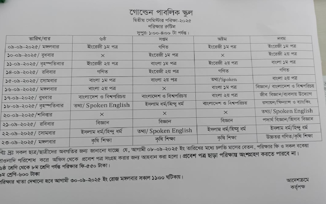 এত দ্বারা সকল ছাত্র-ছাত্রী ও অভিভাবকদের অবগতির জন্য জানানো যাচ্ছে যে, আগামী ০৯-০৯-২০২৫ ইং রোজ সোমবার থেকে "দ্বিতীয় সেমিস্টার পরীক্ষা -২০২৫" শুরু হতে যাচ্ছে। নিম্নে এ বিষয়ে রুটিন প্রদান করা হলো।