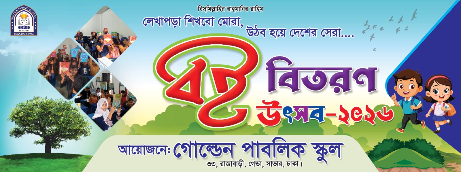 আসসালামু আলাইকুম ' গোল্ডেন পাবলিক স্কুলের 'সকল শিক্ষার্থী ও অভিভাবকদের অবগতির জন্য জানানো যাচ্ছে যে, আগামী ০১/০১/২০২৫ ইং রোজ বৃহস্পতিবার বই উৎসব করা হবে। সময় সকাল ১০:৩০ মিনিট। সকলকে নির্দিষ্ট সময়ে উপস্থিত থাকার জন্য বিশেষ ভাবে বলা হলো। বি. দ্র: পুরাতন বই সাথে করে নিয়ে আসতে হবে ও স্কুল ড্রেস পরে আসতে হবে। স্থান : গোল্ডেন পাবলিক স্কুল এর মাঠ ( ব্রাইট ফিউচার কোচিং সেন্টারের পিছনে মাঠ) আদেশক্রমে মো: লালন স্যার